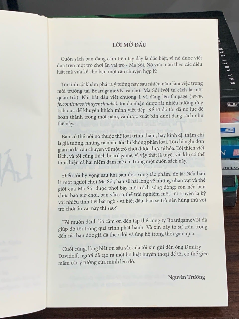 Cuốn sách này có lẽ được viết dựa trên board game “Ma sói” vô cùng nổi tiếng. Tác phẩm có thể là một cuốn tiểu thuyết trinh thám – kinh dị, lấy bối cảnh một ngôi làng bị ám ảnh bởi lời nguyền người sói. Hoặc cũng có thể là một cẩm nang hướng dẫn chi tiết về cách chơi, các chiến thuật, và tâm lý của từng nhân vật trong trò chơi. Với sự bảo trợ của Board Game VN, đây chắc chắn là một món quà thú vị cho cộng đồng những người yêu thích trò chơi đầy kịch tính này.
