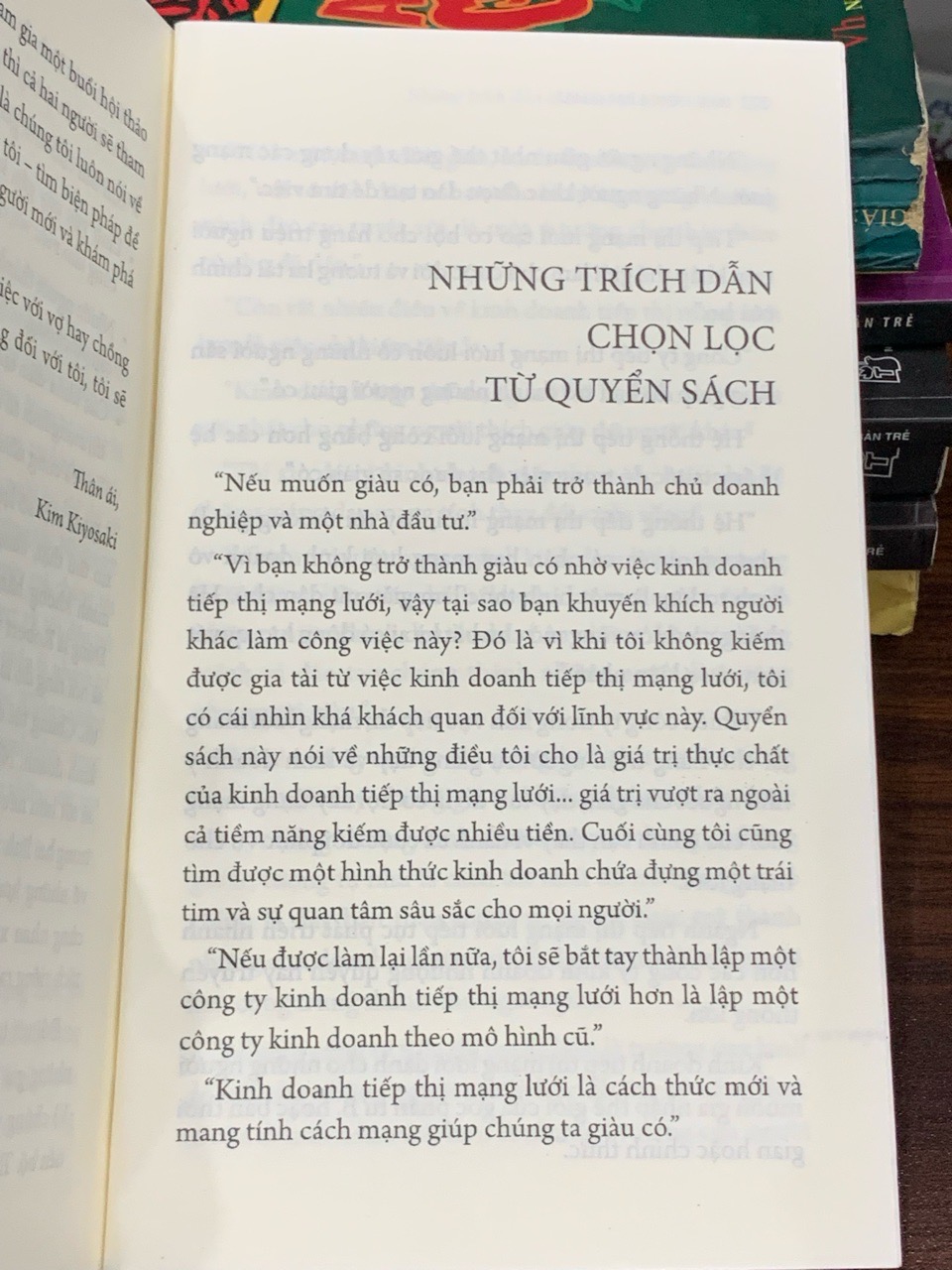 “Trường dạy kinh doanh” mà Robert T. Kiyosaki và Sharon L. Lechter đề cập đến chính là mô hình kinh doanh theo mạng (network marketing). Các tác giả không phân tích mô hình này dưới góc độ bán hàng đơn thuần, mà nhìn nhận nó như một hệ thống giáo dục và phát triển con người toàn diện. Thay vì chỉ tập trung vào lợi nhuận trước mắt, mô hình này được miêu tả là nơi rèn luyện những kỹ năng sống còn trong thế giới kinh doanh hiện đại: kỹ năng giao tiếp, kỹ năng lãnh đạo, khả năng vượt qua nỗi sợ hãi bị từ chối, quản lý tài chính cá nhân, và quan trọng nhất là tư duy của một chủ doanh nghiệp thực thụ. Cuốn sách lập luận rằng giá trị lớn nhất mà một người nhận được từ kinh doanh theo mạng không phải là sản phẩm hay tiền bạc, mà là sự trưởng thành vượt bậc về mặt cá nhân và những bài học kinh doanh vô giá mà không một trường lớp truyền thống nào có thể cung cấp.
