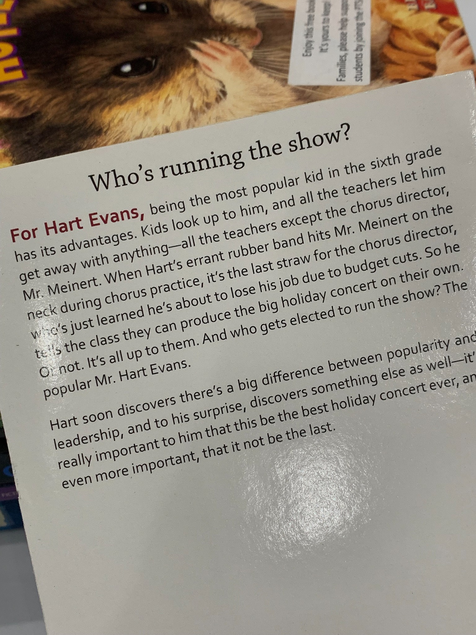 For the past 12 years, music teacher Mrs. Tambori has directed the chorus’s popular holiday concert. But when the new middle school principal, Mr. Meinert, decides to cut the arts budget, he cancels the concert. The students, led by sixth-grader Hart Evans, decide to take matters into their own hands. They plan a secret, student-run concert to show the school board how important the music program is. It’s a story about teamwork, creativity, and the power of students’ voices.